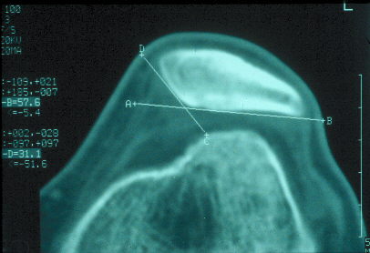 El TAC o escáner sirve para estudiar en profundidad el caso, como este que se muestra a la derecha donde se ve perfectamente la basculación de la rótula con desplazamiento externo, con lo que se encuentra subluxada o fuera del canal troclear.